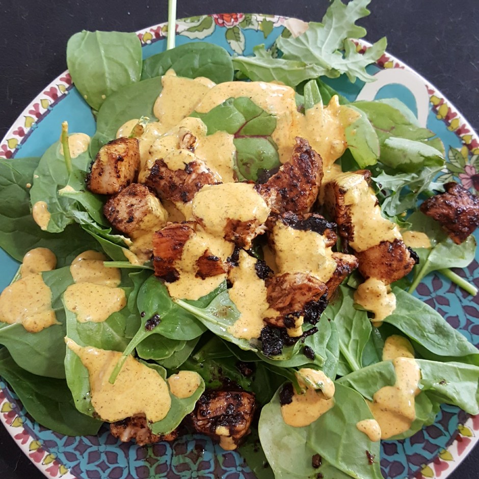 The chicken should be finished by now. Check it. Dice and place on top of the bed of greens. Dollop with dressing. If you like, you can add carrots, tomatoes or avocado, it all depends on you and how you are eating for the day and what strikes your fancy.